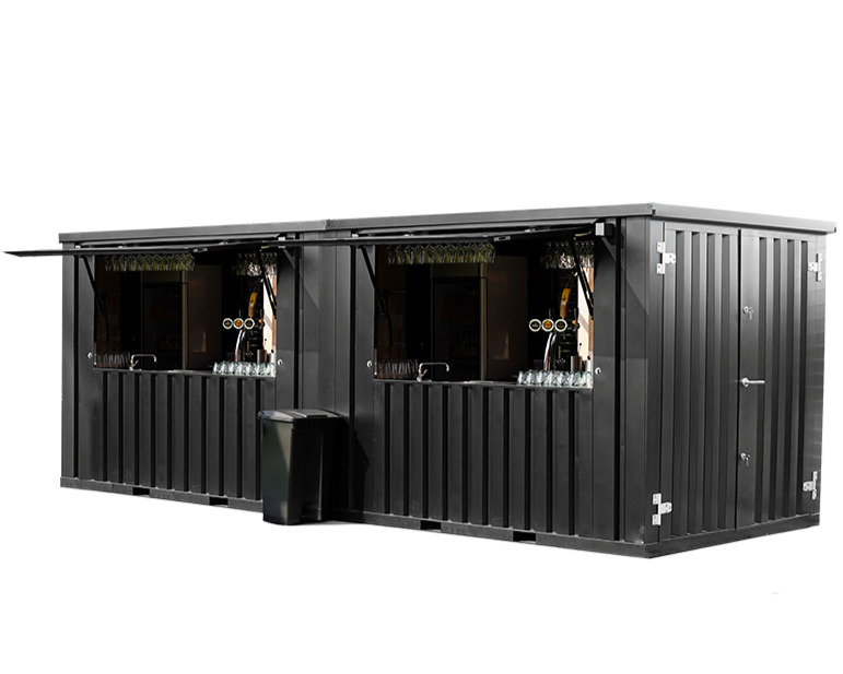 Le bar extérieur XL fait environ 8×2 mètres, est de couleur noire et possède un auvent pliable, ses dimensions sont à peu près les mêmes que celles d’un conteneur démontable de 26 pieds.