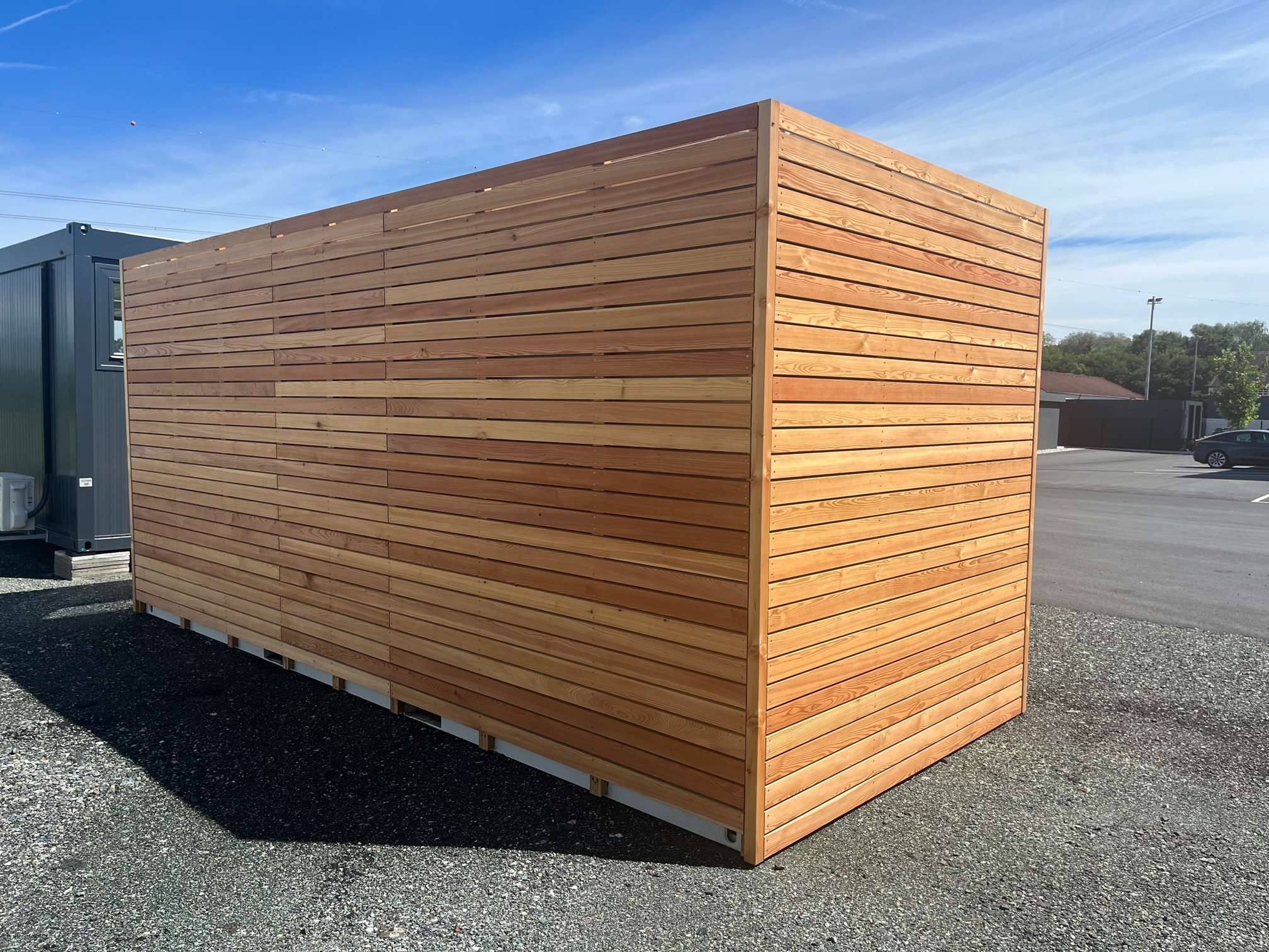 Ce conteneur de vente neuf de 20 pieds transforme un espace modulaire en un lieu d’accueil professionnel et esthétique. Revêtu d’un bardage en mélèze de Sibérie sur l’ensemble de sa périphérie, il allie la robustesse d’une structure maritime à l’élégance chaleureuse du bois. Son portail d’entrée en aluminium avec vitrage en verre feuilleté sécurisé (ESG) offre une présentation soignée et une accessibilité optimale. Polyvalent, il s’adapte aussi bien aux usages de showroom, d’espace de vente, de bureau ou d’accueil, avec la possibilité d’associer plusieurs modules pour agrandir l’espace selon vos besoins.